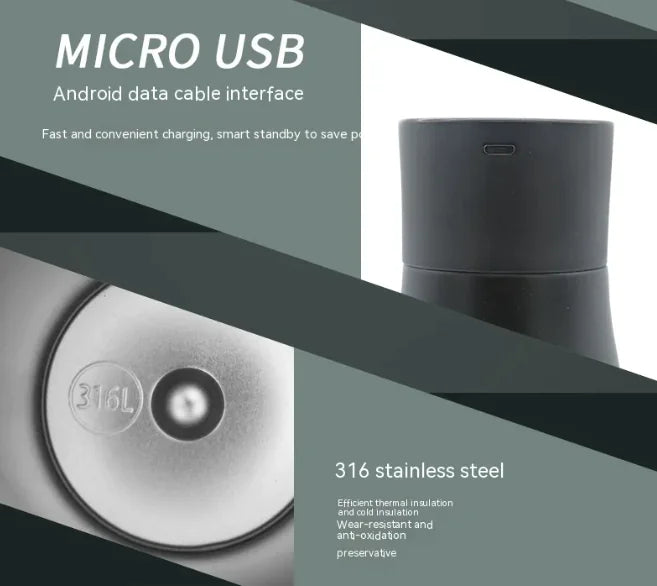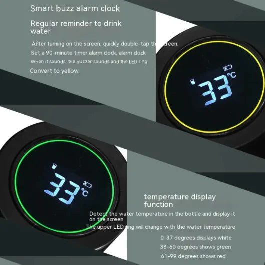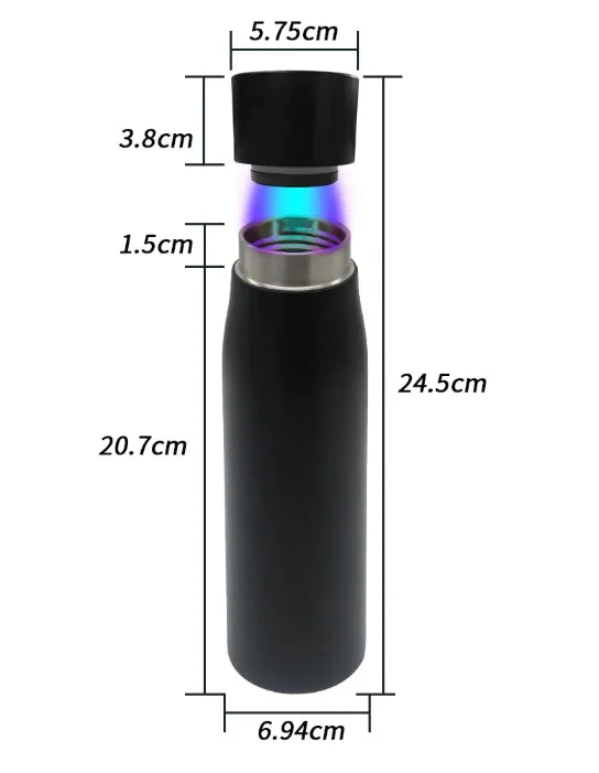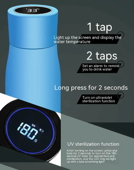 Mantente hidratado de forma inteligente y segura con la Botella Térmica al Vacío con Pantalla LED y Función de Esterilización. Fabricada en acero inoxidable de alta calidad, conserva tus bebidas calientes o frías durante horas, combinando tecnología moderna con un diseño elegante y funcional.