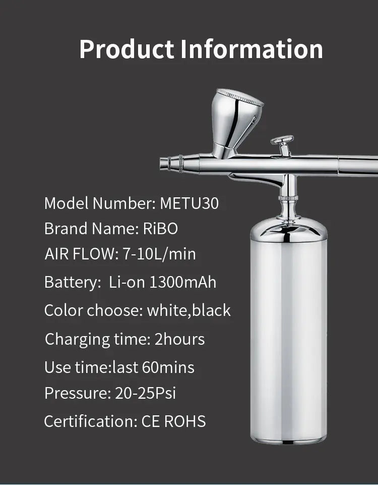 Con un flujo de aire de 7 a 10 litros y una presión de 20–25 psi, el dispositivo RiBO ofrece una aplicación precisa y efectiva, ideal para mejorar la absorción de sérums y productos faciales.